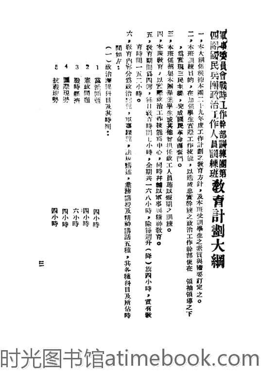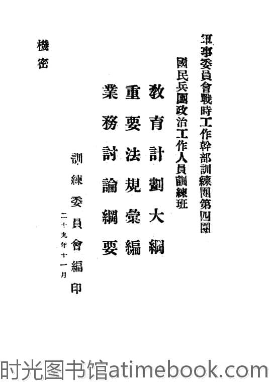 | 网盘路径:/时光图书馆珍藏系列/书籍文件/老图书/《*事委员会战时工作干部训练团第四团国民兵团政治工作人员训练班教育计划大纲,重要规则汇编,业务讨论纲要》电子版合集.db | ||