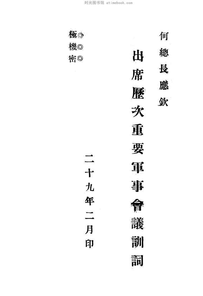 | 网盘路径:/时光图书馆珍藏系列/书籍文件/老图书/《何总长应钦出席歴次重要*事会议训词》电子版合集.db | ||