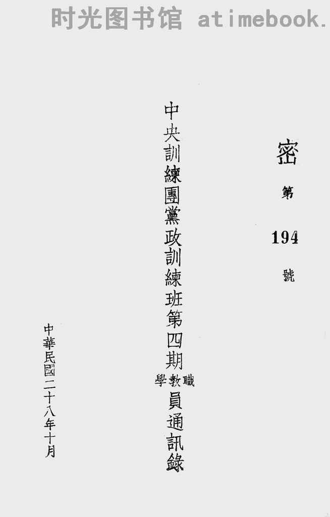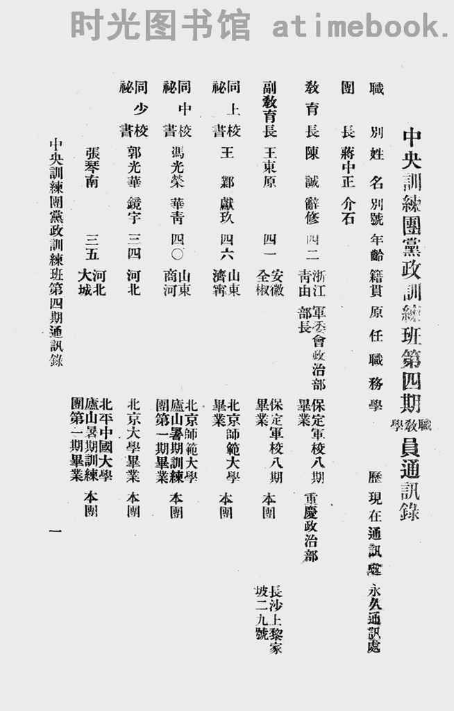 | 网盘路径:/时光图书馆珍藏系列/书籍文件/老图书/《*训练团*政训练班第四期职教学员通讯录》电子版合集.db | ||