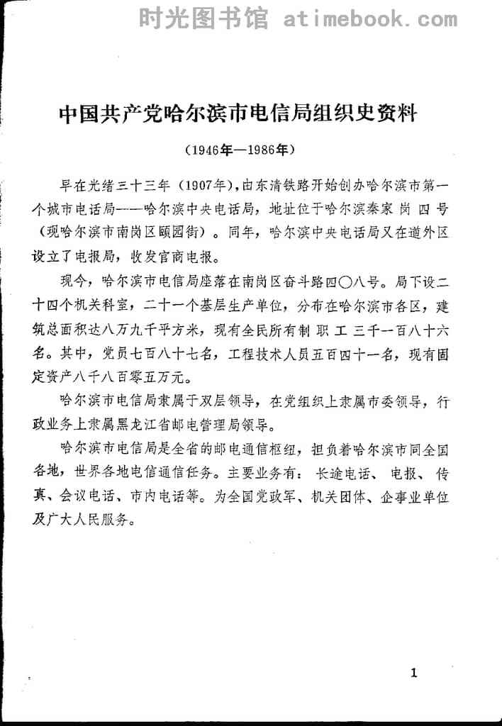 | 网盘路径:/时光图书馆珍藏系列/书籍文件/老图书/《中国**哈尔滨市电信局组织史资料(1946-1986)》电子版合集.db | ||