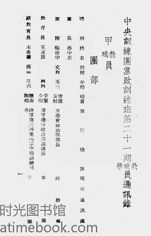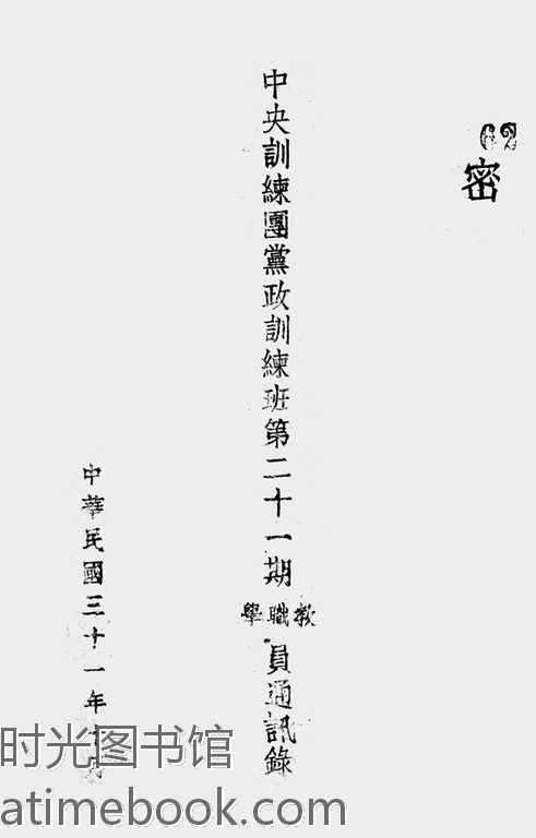 | 网盘路径:/时光图书馆珍藏系列/书籍文件/老图书/《*训练团*政训练班第二十一期教职学员通讯录》电子版合集.db | ||