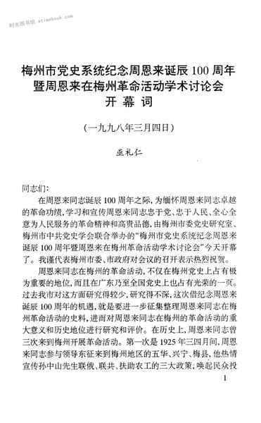 2-梅州市*史系统纪念周恩来诞辰100周年暨周恩来在梅州*活动学术讨论会开幕词巫礼仁