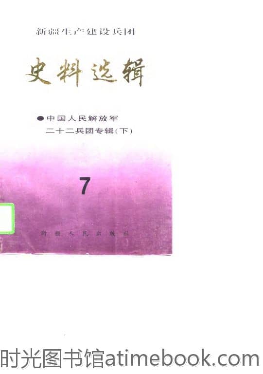 | 网盘路径:/时光图书馆珍藏系列/书籍文件/老图书/《新疆生.产.建.设.兵.团.史料选辑_第7辑(中国.人.民.解.放.*.二十.二.兵.团专辑_下)》电子版合集.db | ||